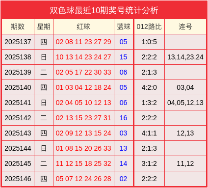开奖牵挂:双色球2025146开奖号码为05、07、12、24、26、28+02。其中012路比为2:2:2、无连号。
